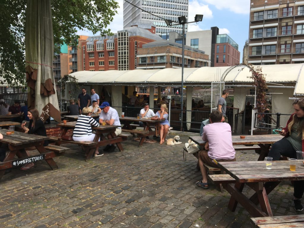 A quick stumble through the busy Harbourside Market and past volleyball matches in Queen Square takes us to Bristol’s legendary cider boat, The Apple, where we find a bench outside amongst the casual daytime drinkers and dayglo hen parties. Gabe gets us all two halves each, including Hecks‘ Kingston Black, to demonstrate the West Country tradition of cider making using a single variety of apple. Compared to what we tried in The Stable, this has a real taster of the farmyard about it, but Gabe is a little let down. “It’s disappointingly not as rough as I was hoping it would be!” he says with a belly laugh.