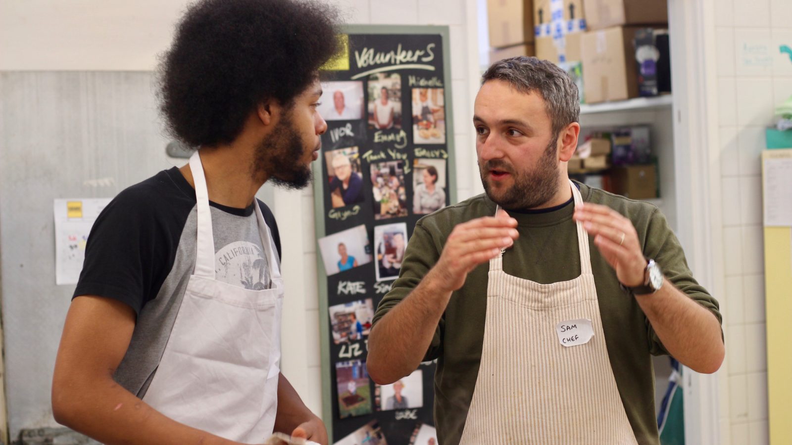 Next to arrive are the young people, some nervously tying up their white aprons and others chatting excitedly, eyeing up the ingredients they’ll be cooking with later.