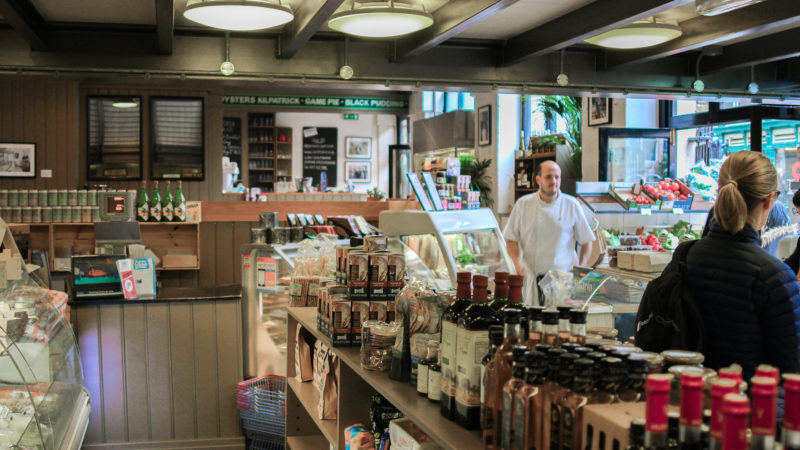 Elsewhere, heaving shelves hold a vast array of wines, while fresh produce sits in boxes by the door. An open doorway behind one of the fresh food counter offers up views of a polished chrome kitchen, where a chef can be seen bustling around, getting ready for the lunch rush.