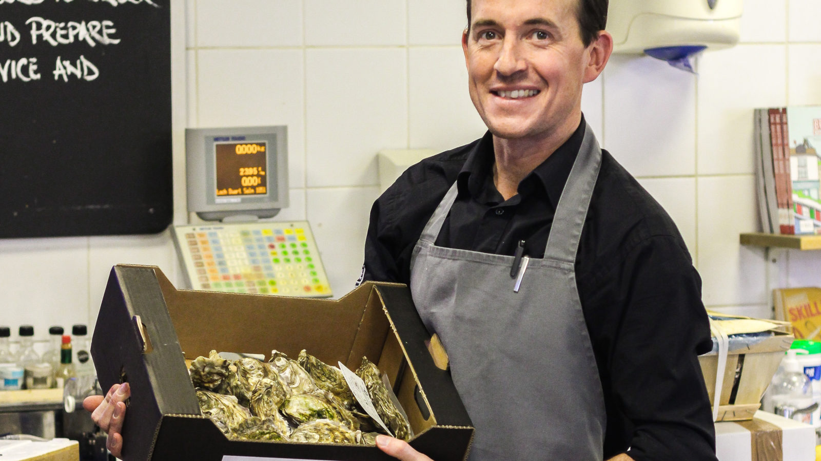 Joe opens a box of fresh oysters, on sale at Source