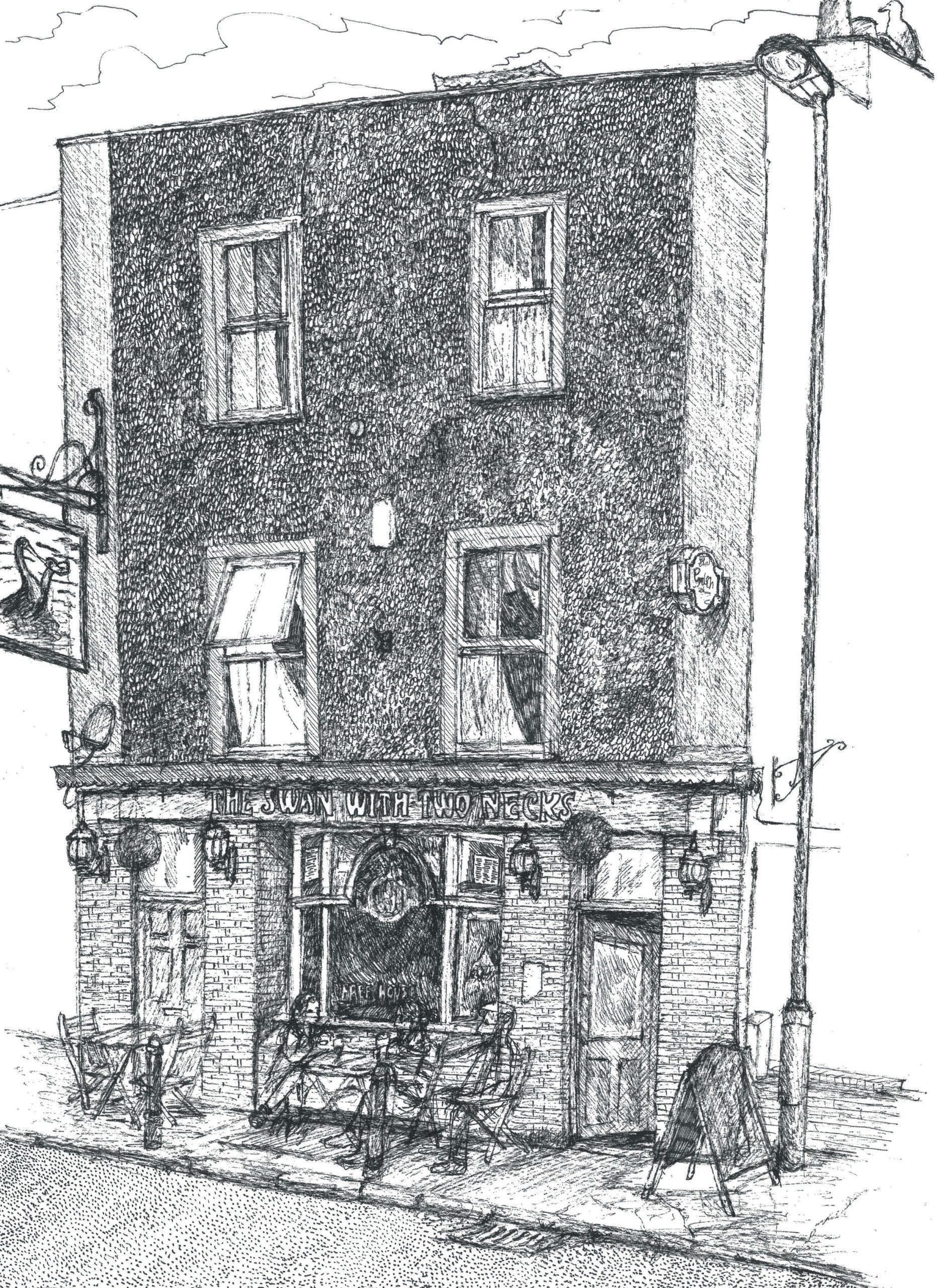 “I sat in front of the pub and drew in my sketchbook over a period of about three days, enjoying adding all the ornamental details of the facade, the textures of the bricks and reflections in the windows.