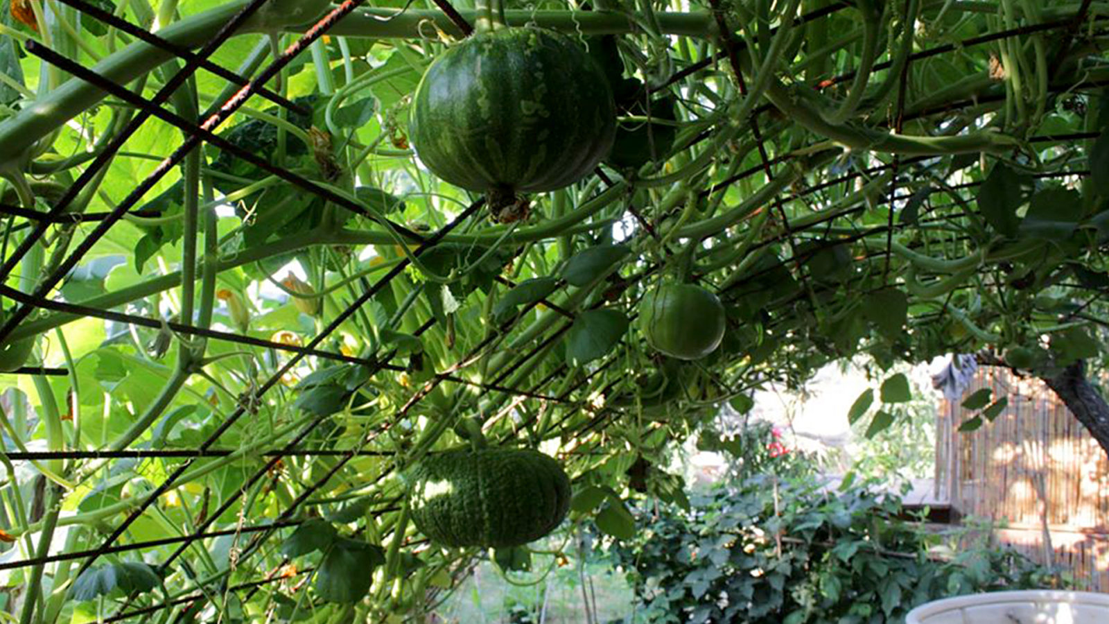 You don’t need any special equipment – climbers can ramble up small trees, verandas or fences, or trellises made of branches; courgettes and other squashes are happy trailing along a wall.