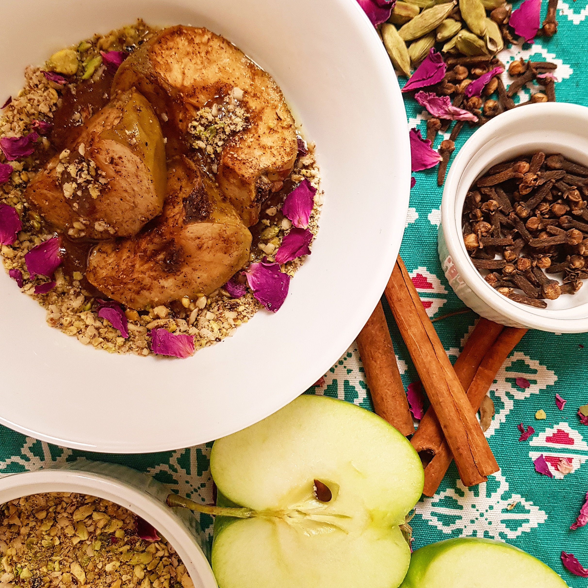 Menu items include bateta vada – spiced mashed potato and coconut balls jewelled with golden sultanas, dipped in a gram flour batter and deep fried; pani puri – a round, hollow, crispy puri filled with potato and chickpeas, coriander and tamarind chutneys, sev and puffed rice, to be dipped in tamarind water and eaten in one go; and a vegan-friendly dessert of warm chai-spiced roast apple with chai caramel, ground hazelnuts, pistachios and rose petals.