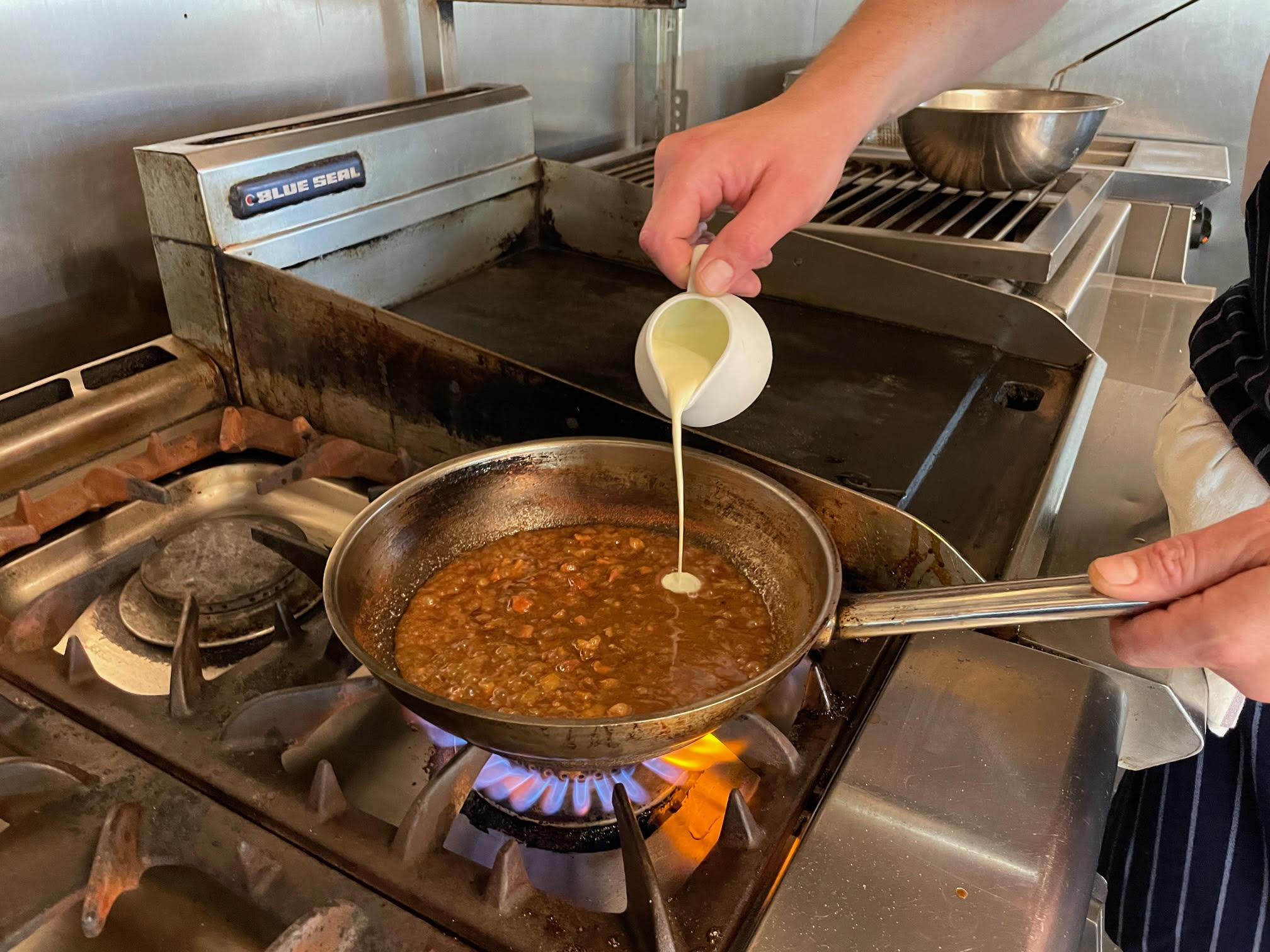 Add 150ml double cream and turn the heat down.