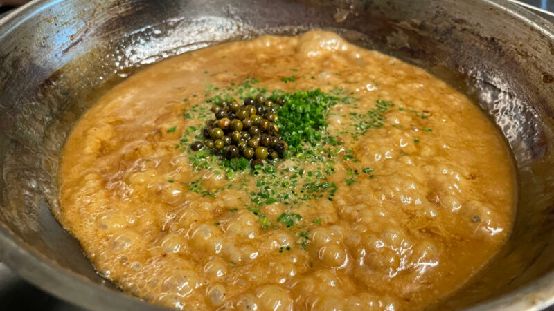 Back to the sauce – add green peppercorns and fresh chives and mix in. Take off the heat.