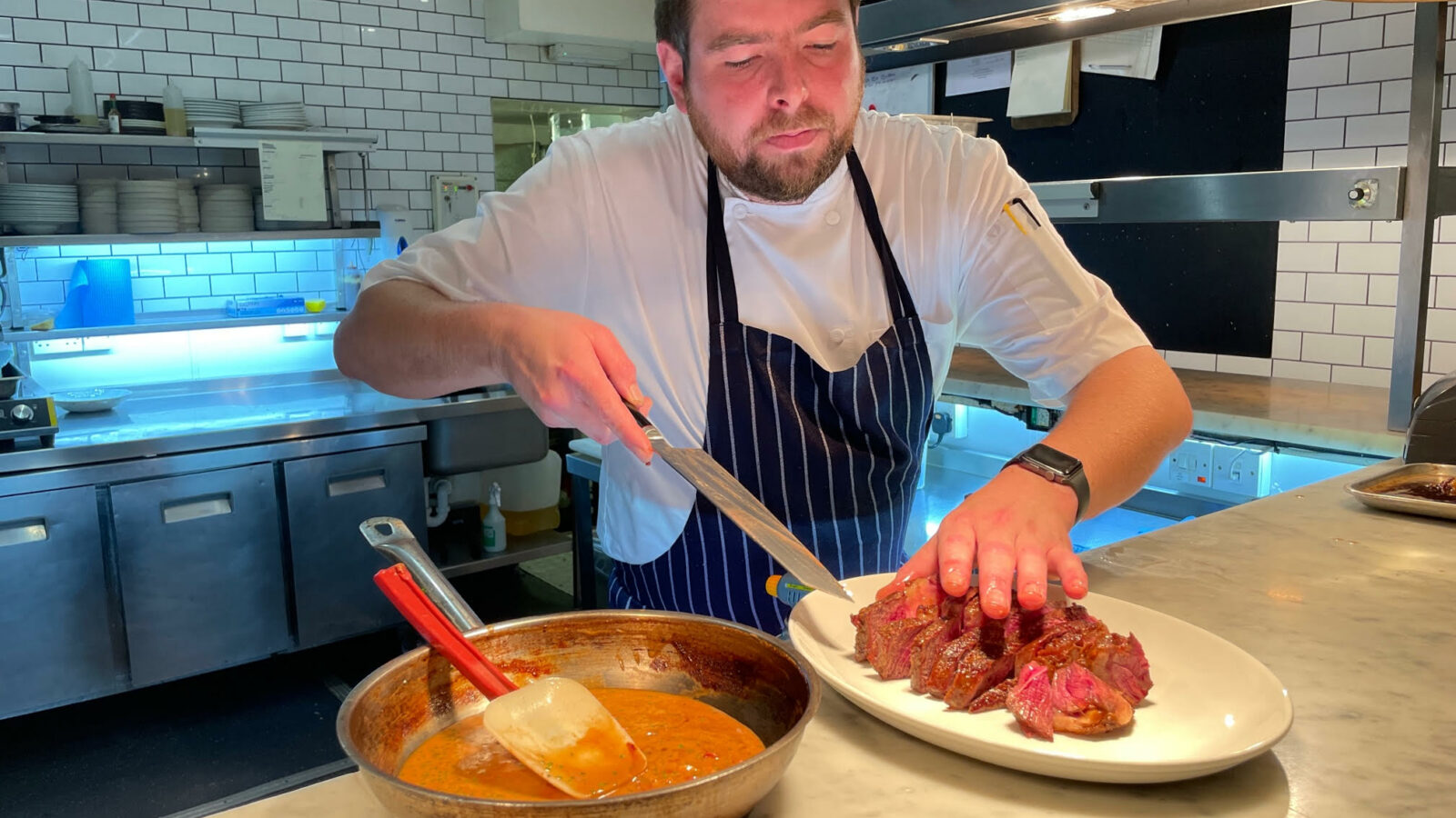 Once the steak is removed from the oven, it needs to rest. As a rule of thumb, Oscar recommends resting it for as long as you’ve cooked it. Pour the butter over the resting steak, but leave any sticky residue in the pan to aid the sauce.