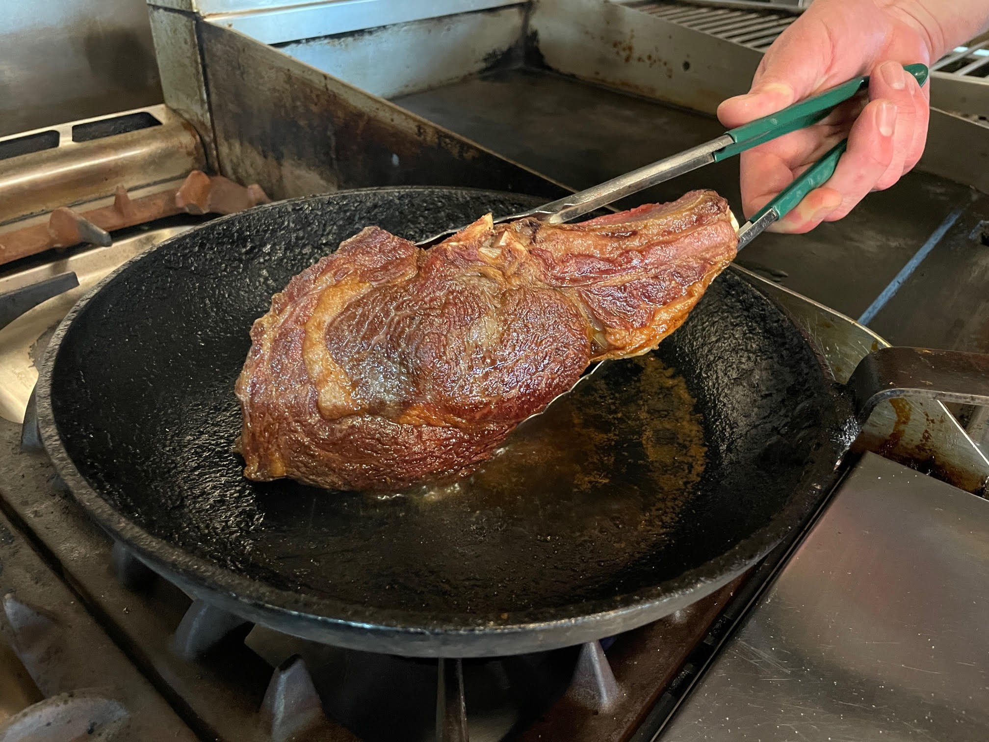Sear each side until golden brown – approximately four minutes per side for this steak, which weighs a kilo.