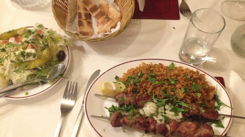 George takes my empty starter plate away, puts it on the counter, picks up my huge main course and delivers it to me: if there are any complaints to be made here, slow service is certainly not one of them. I’ve barely got the last bit of vine leaf out of my teeth before I’m tucking into two excessively long skewers of meat, accompanied by an enormous mound of rice and a side salad of lettuce, tomato, feta and black olive (singular).