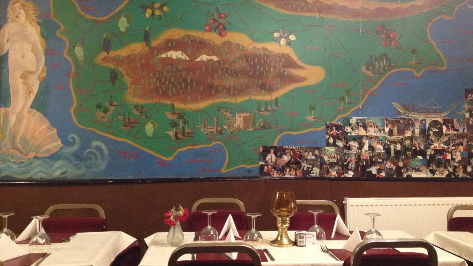 Sidle your way around three feet of slick takeaway bar and you’ll find yourself stepping into a little corner of Cyprus. Holiday souvenirs dangle from the ceiling and are crammed onto shelves above the plastic tablecloths – decorative plates, miniature bottles of ouzo and a novelty ukulele. It would be unbearably kitsch if it wasn’t so sincere.