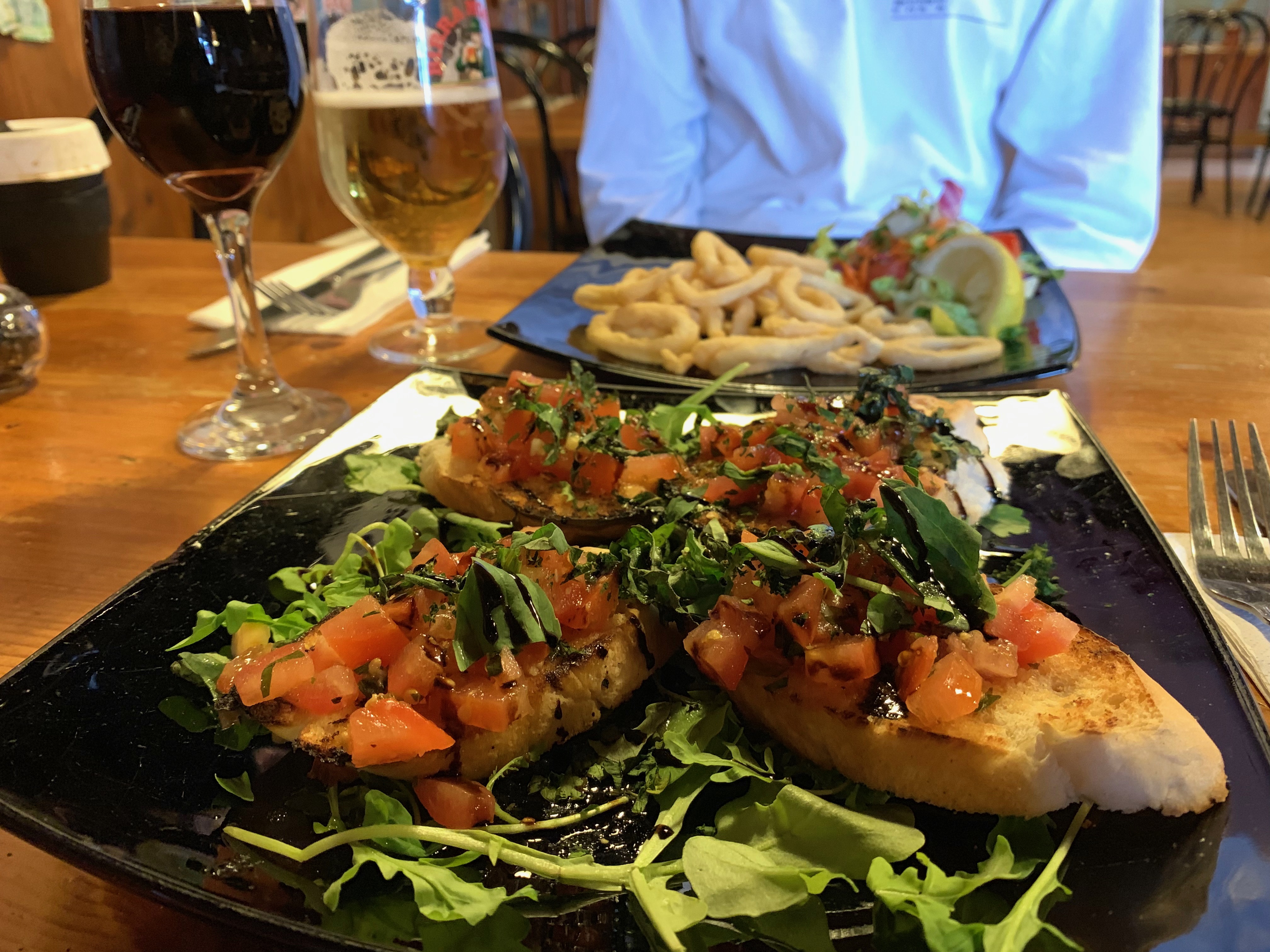 Sobering thoughts aside, the starters arrive. A generous four slices of bruschetta – toasted bread and fresh, tossed tomatoes – are arranged neatly among fresh rocket and balsamic drizzles.