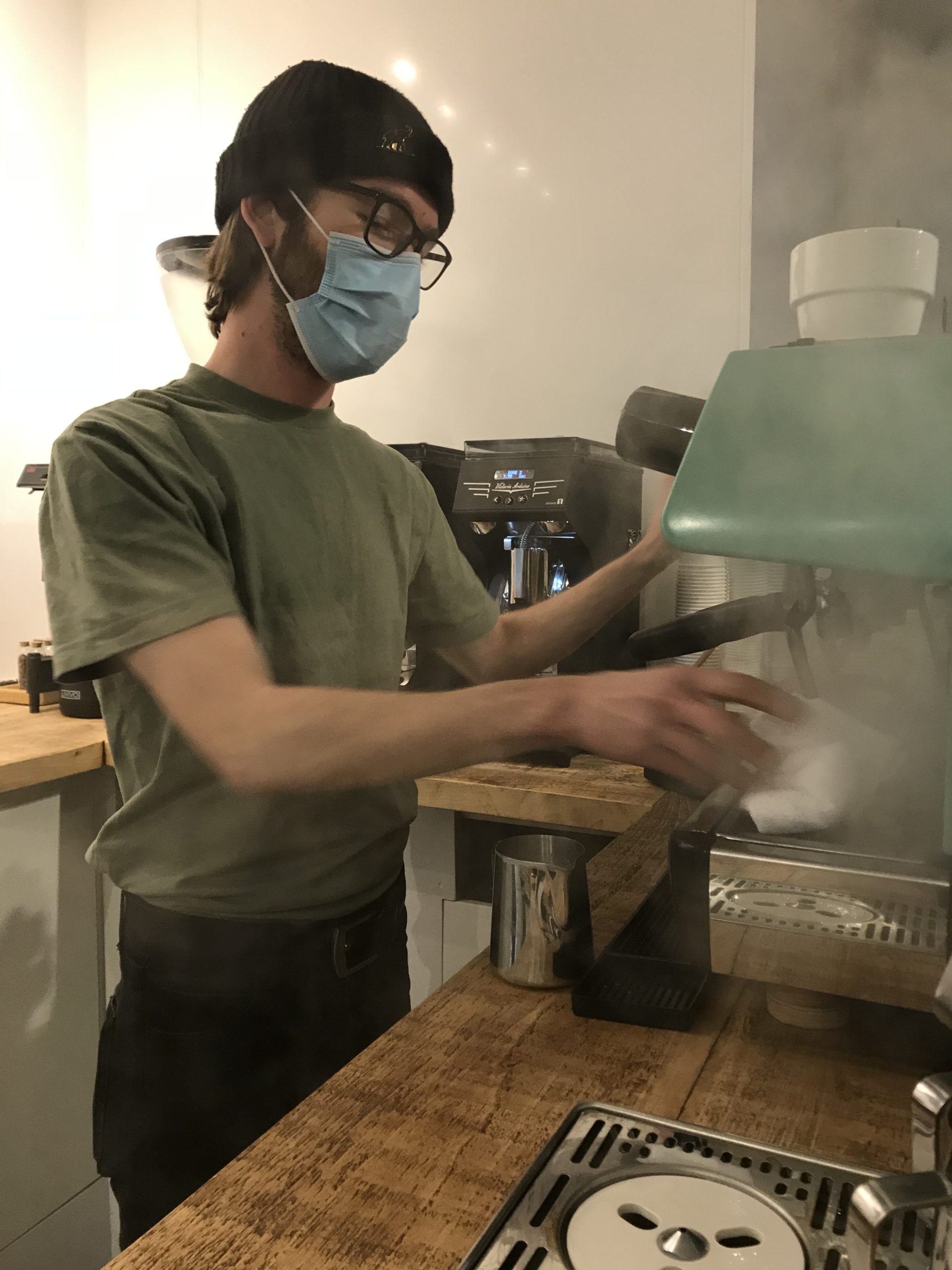 Jack Hudspith behind the La Marzocco FB80 in New Cut Coffee – photo: Martin Booth