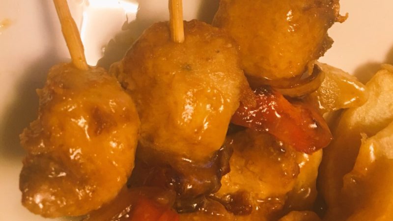 “Marling Fish Bar can change nearly every dish to a vegan equivalent and is DELICIOUS. Here are the mock chicken satay skewers.”