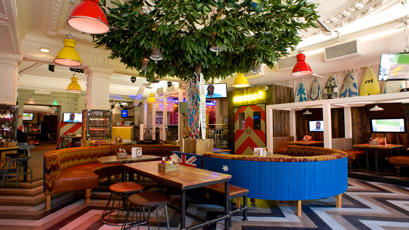 The new-look bar features linked-screens showing under-sea and beach footage and a tree in the centre of what was originally a bank.