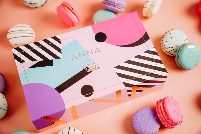 The box with abstract illustrations in artist Mr Penfold’s signature style will contain six assorted flavours of macarons, created by Anna Tyler from Anna Cake Couture.