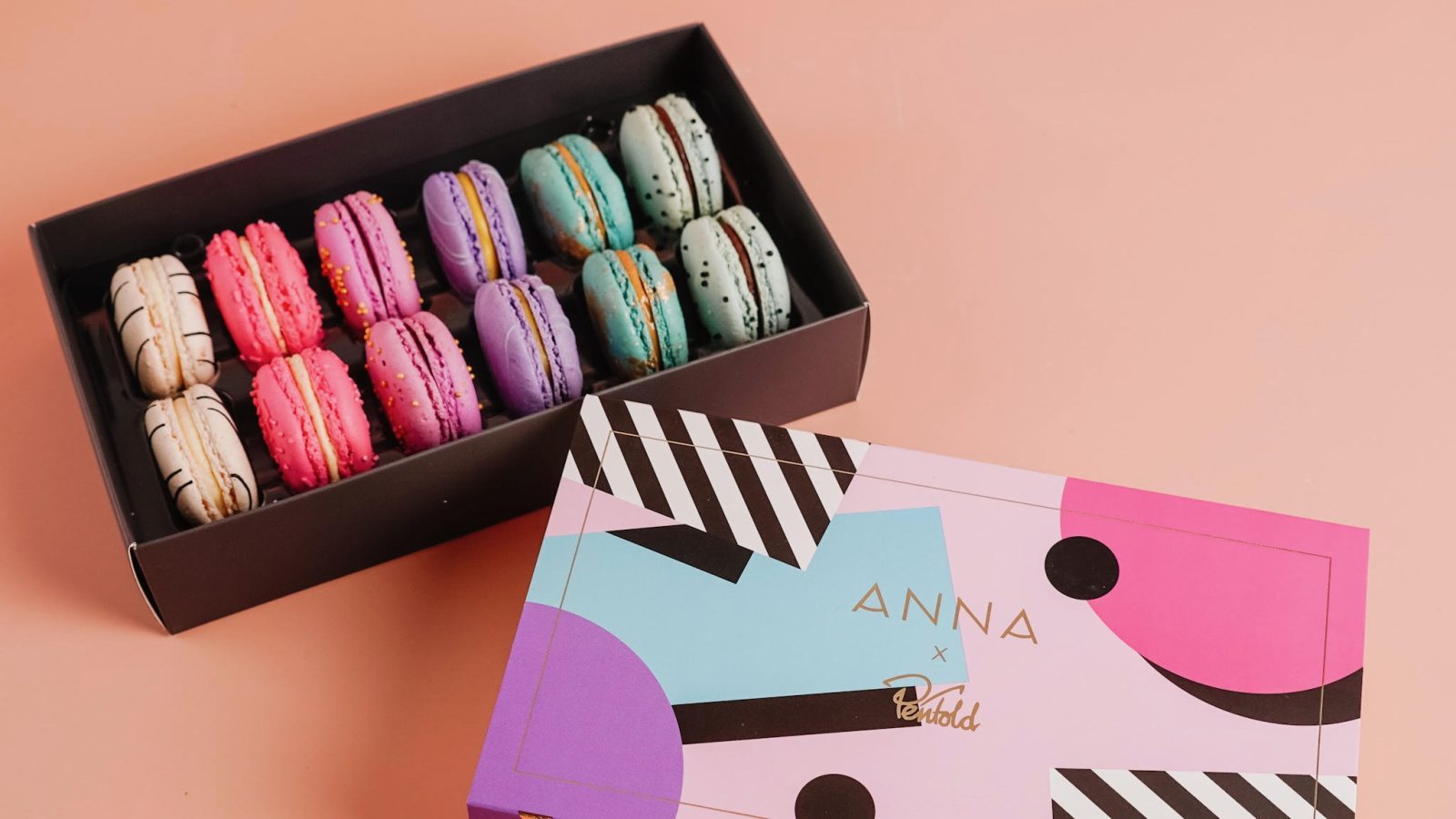 Each macaron with gold foil plating will be of a different flavour, specially curated to echo the colours of Penfold’s illustration on the box’s exterior.