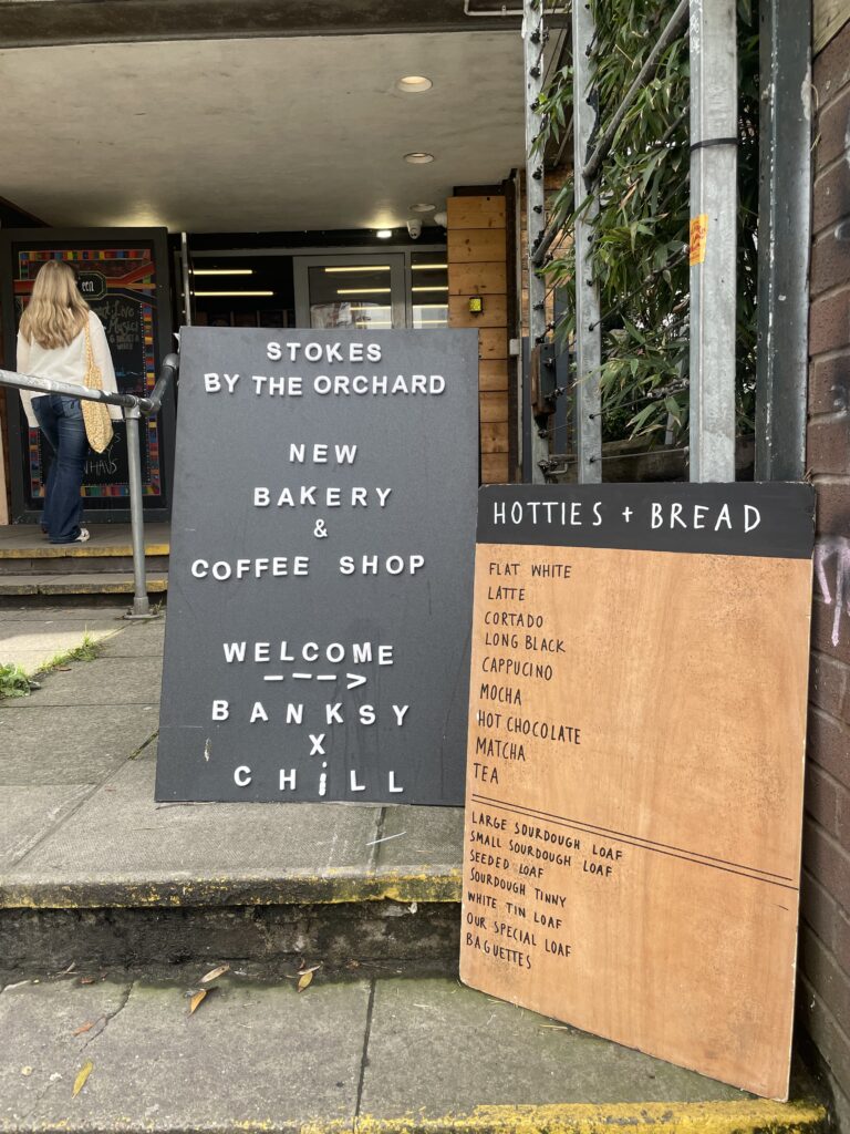 Two signs on the steps to Stokes by the Orchard promise not just ‘hotties and bread’ but also ‘Banksy and chill’.