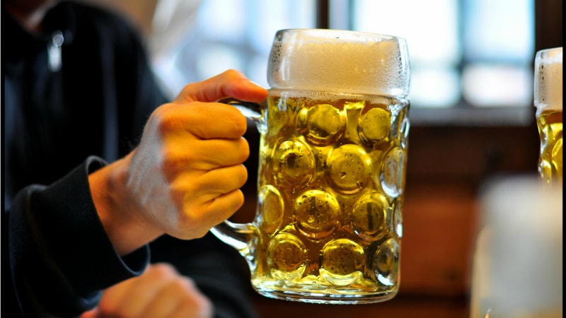 Expect massive mugs of beer served on long tables by men in leather breeches and buxom blondes with traditional Dirndl corseted dresses.