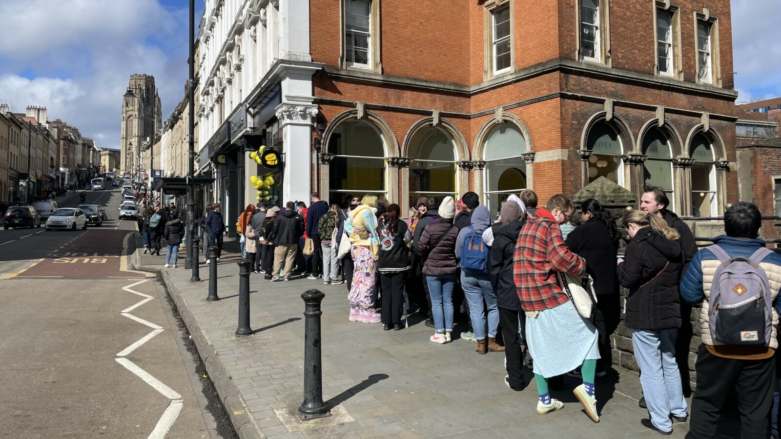 The queue on Saturday stretched from Fluffy Fluffy at the bottom of Park Street, past Banksy’s Well Hung Lover mural and around the corner onto Unity Street.
