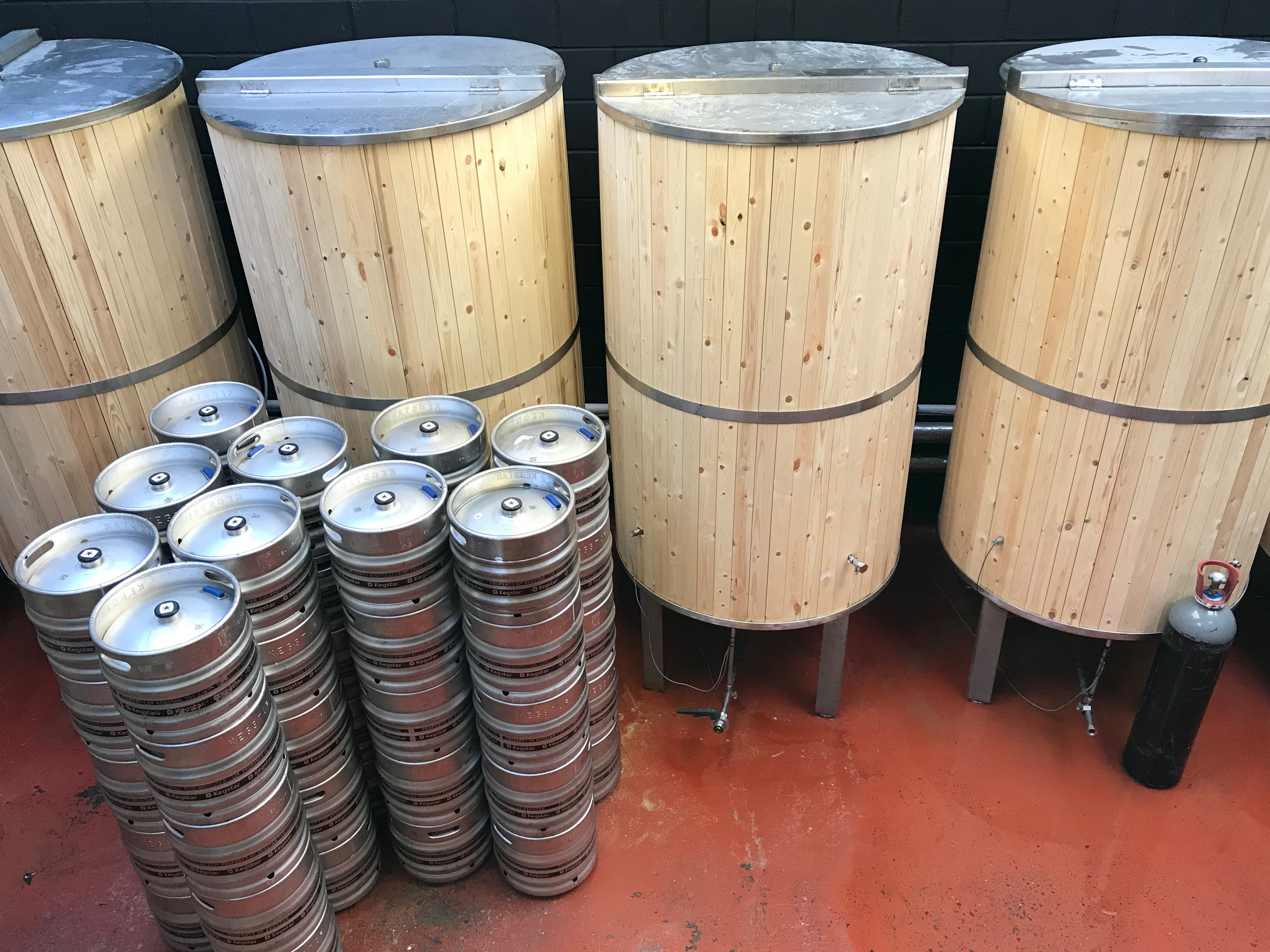With the beers made downstairs, a mezzanine level upstairs has been transformed into a tap room with ten keg lines and a bar made from concrete slabs above wood from the brewery’s former home.