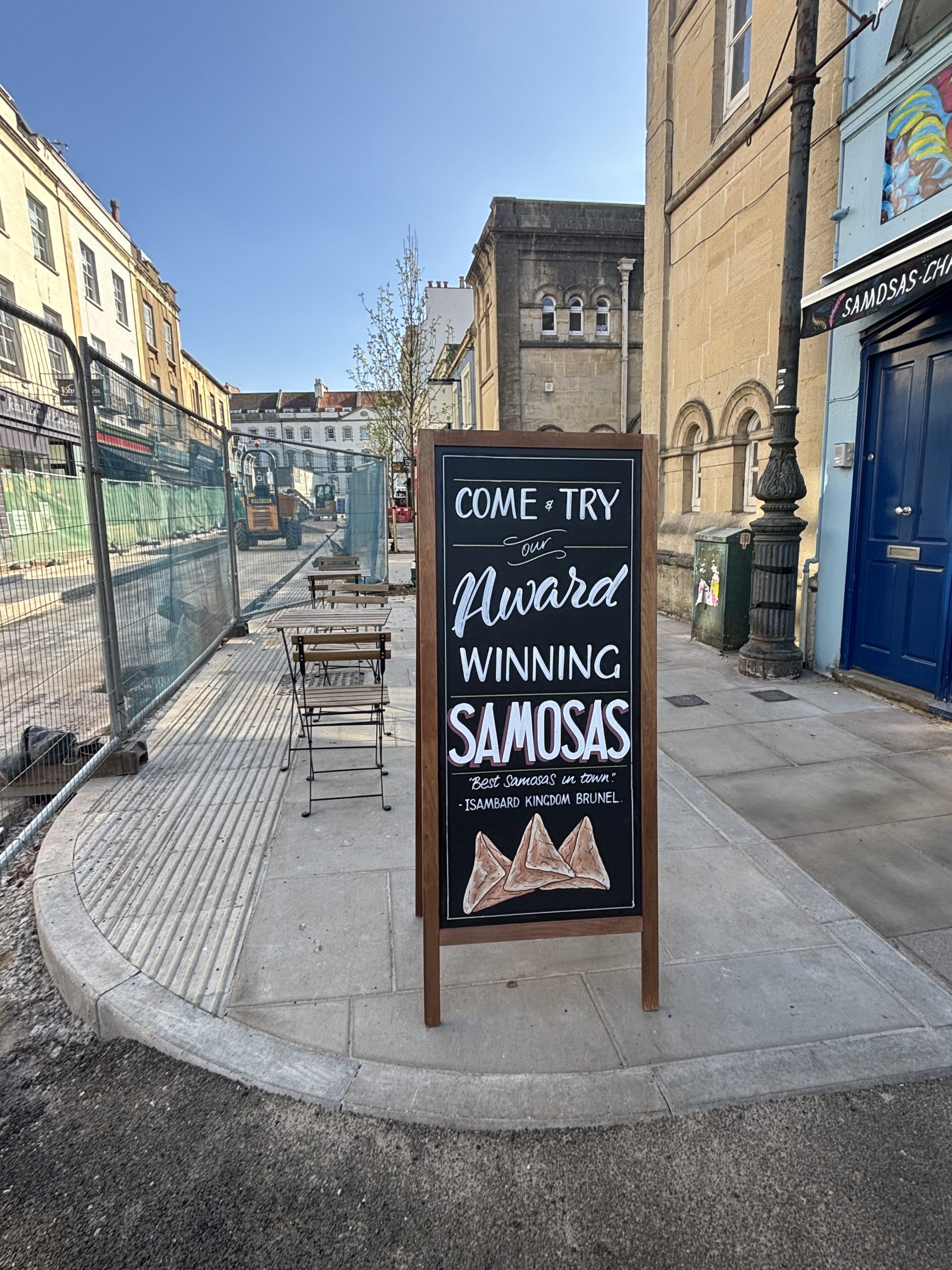 A sign outside jokingly claims Isambard Kingdom Brunel finds owner Niraj’s award winning samosas “the best samosas in town”.