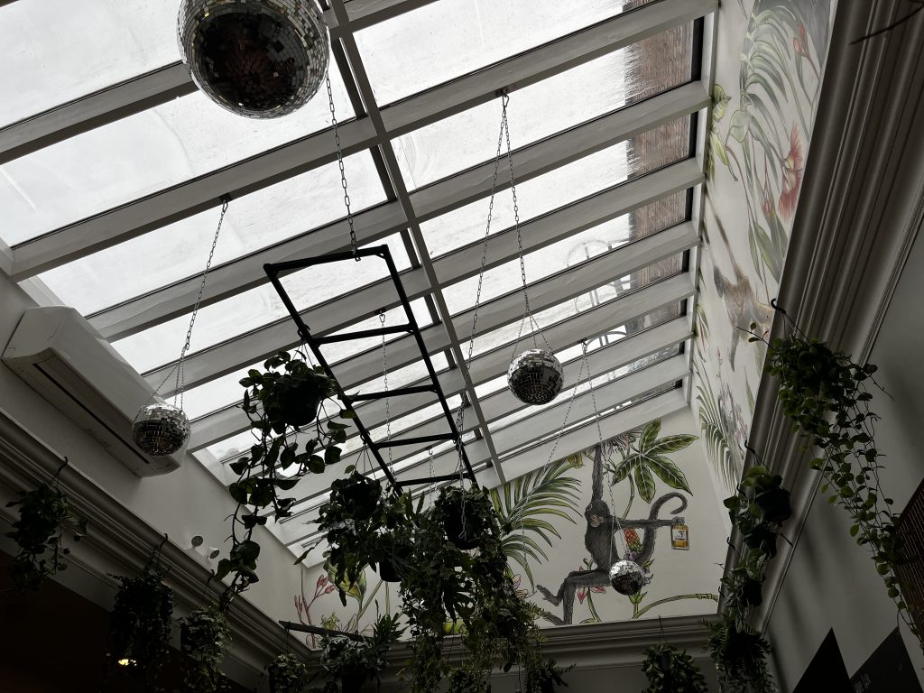 Inside the new cafe are disco balls and foliage hanging from the ceiling
