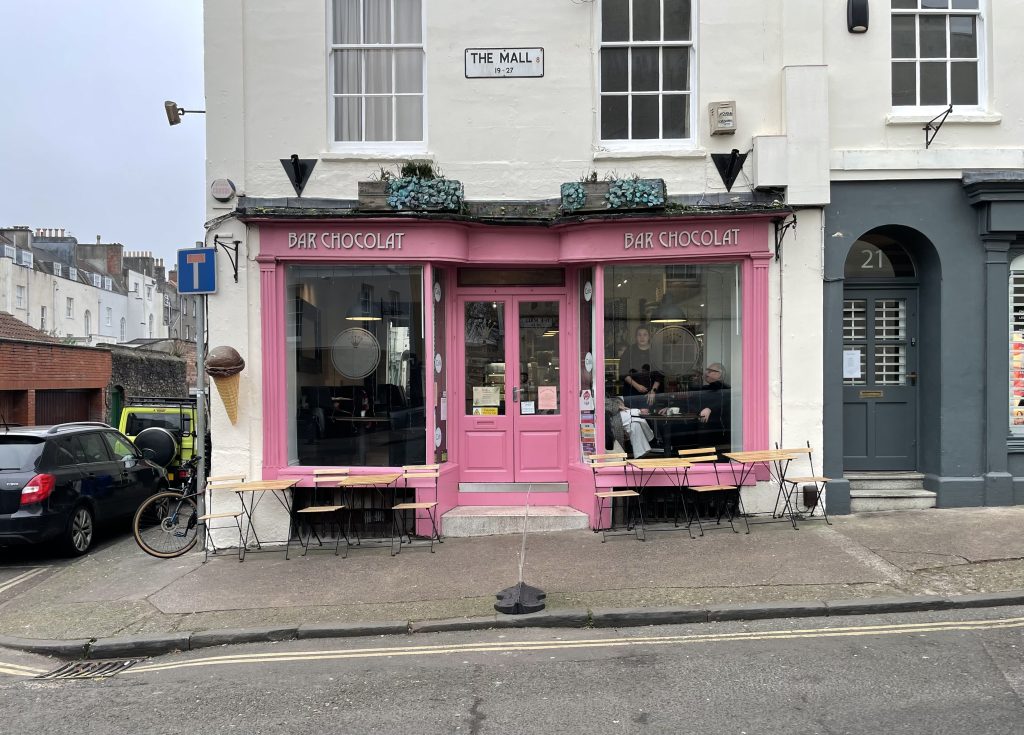“Bar Chocolat has been in the village since 2000. The shopfront has been a variety of colours from purple, brown, blue and us finally settling on PINK!