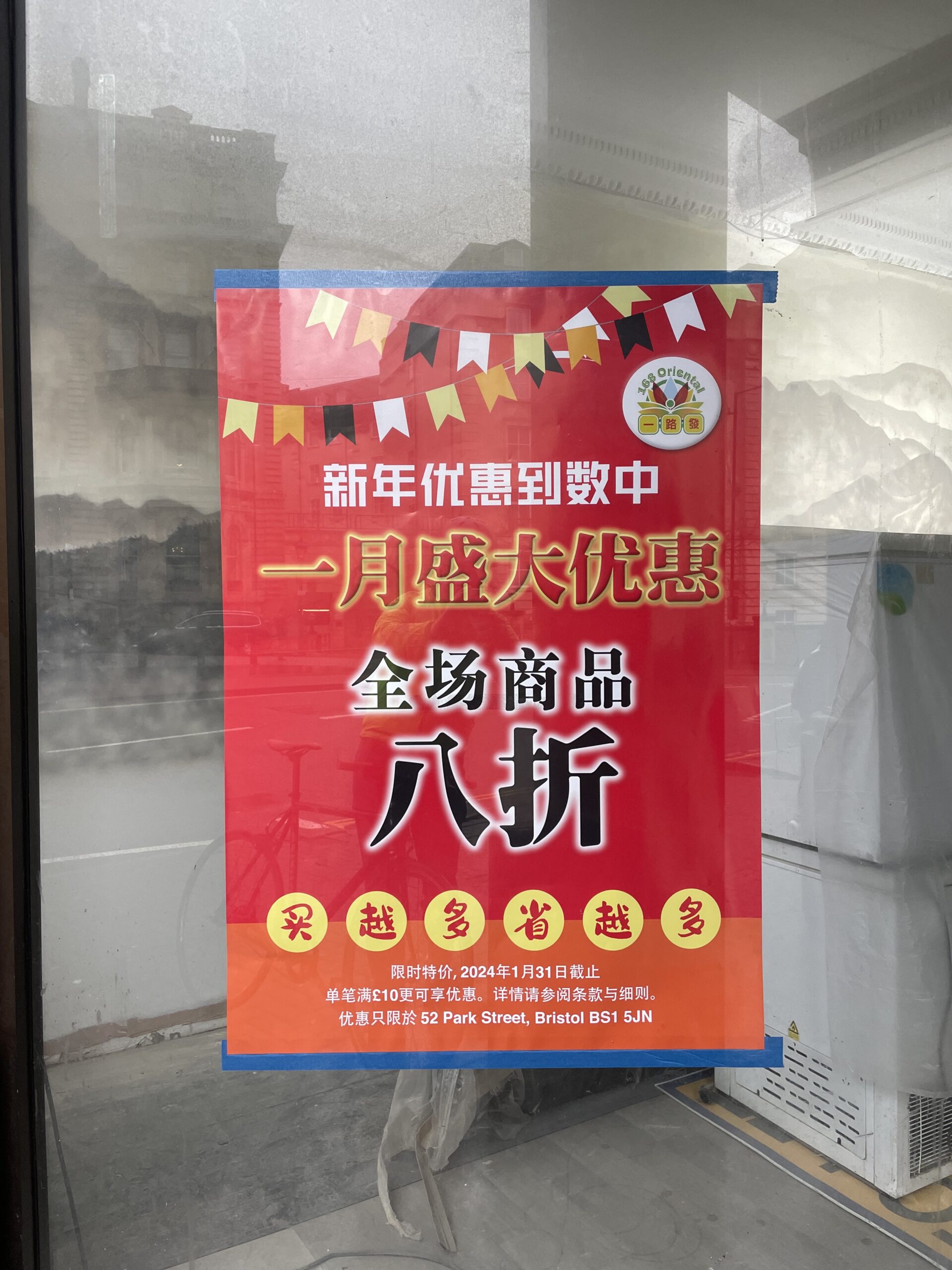 A sign on the window to 168 Kitchen advertises 20 per cent off at the owner’s oriental supermarket a stone’s throw away