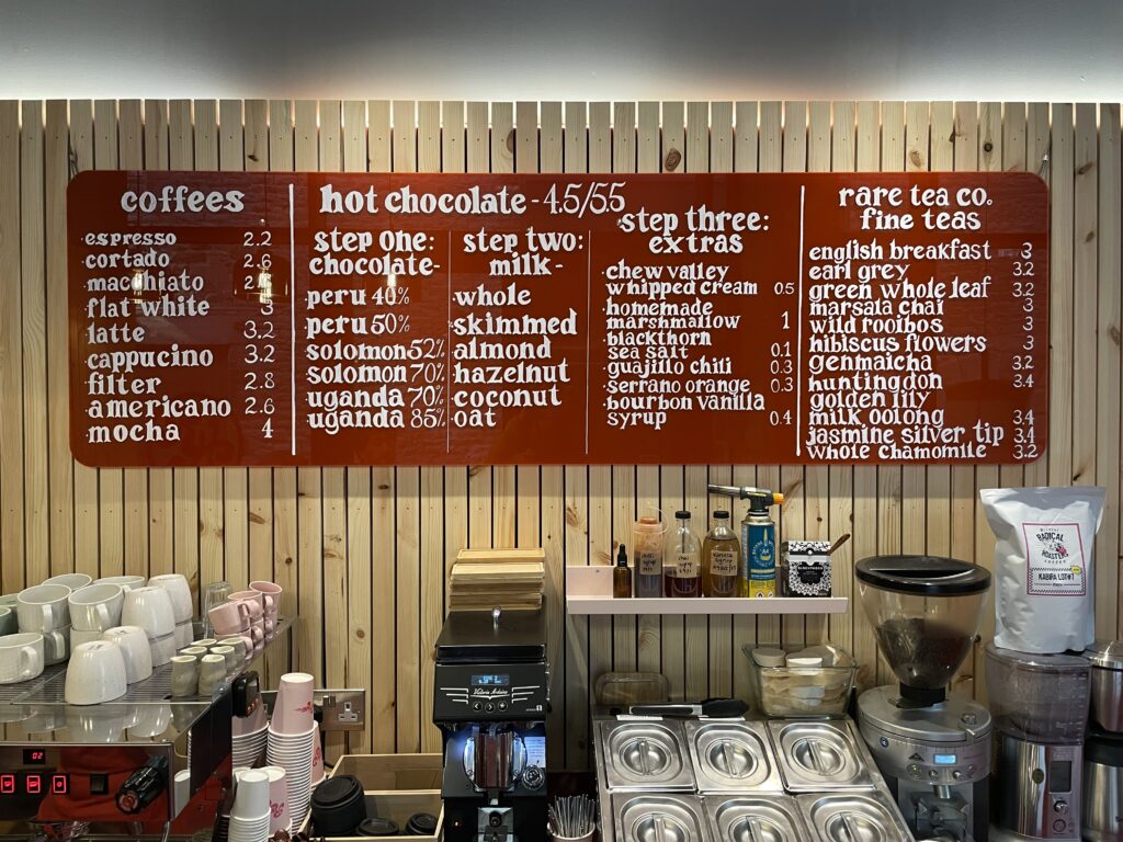 Hot chocolate is available to be made with single-origin chocolate imported from Peru, the Solomon Islands and Uganda, with single-origin bars and cacao nibs also for sale.