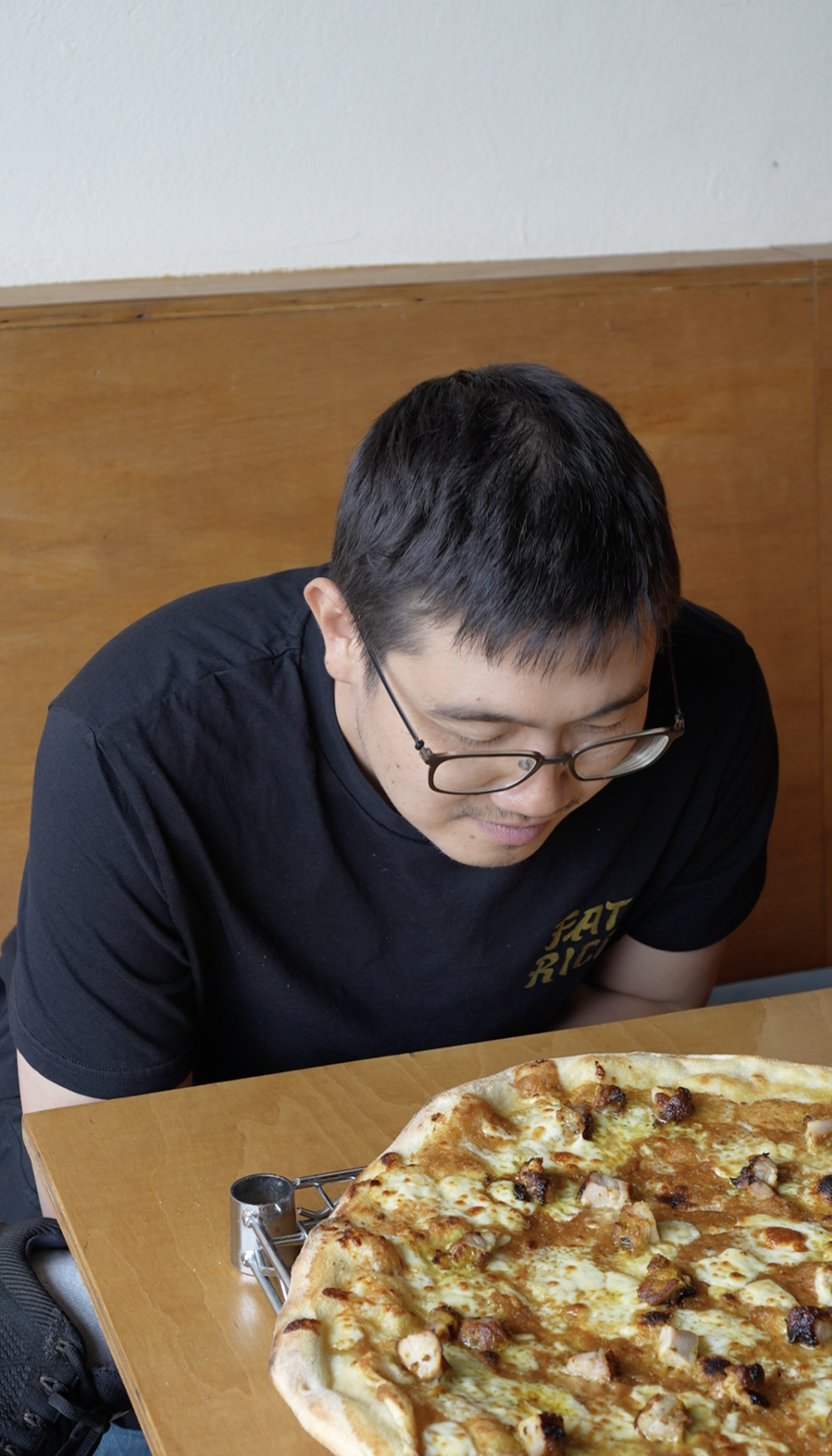 Kit from Fat Rice smelling the exclusive collaboration pizza fresh from the oven – and trust us, it smells amazing!