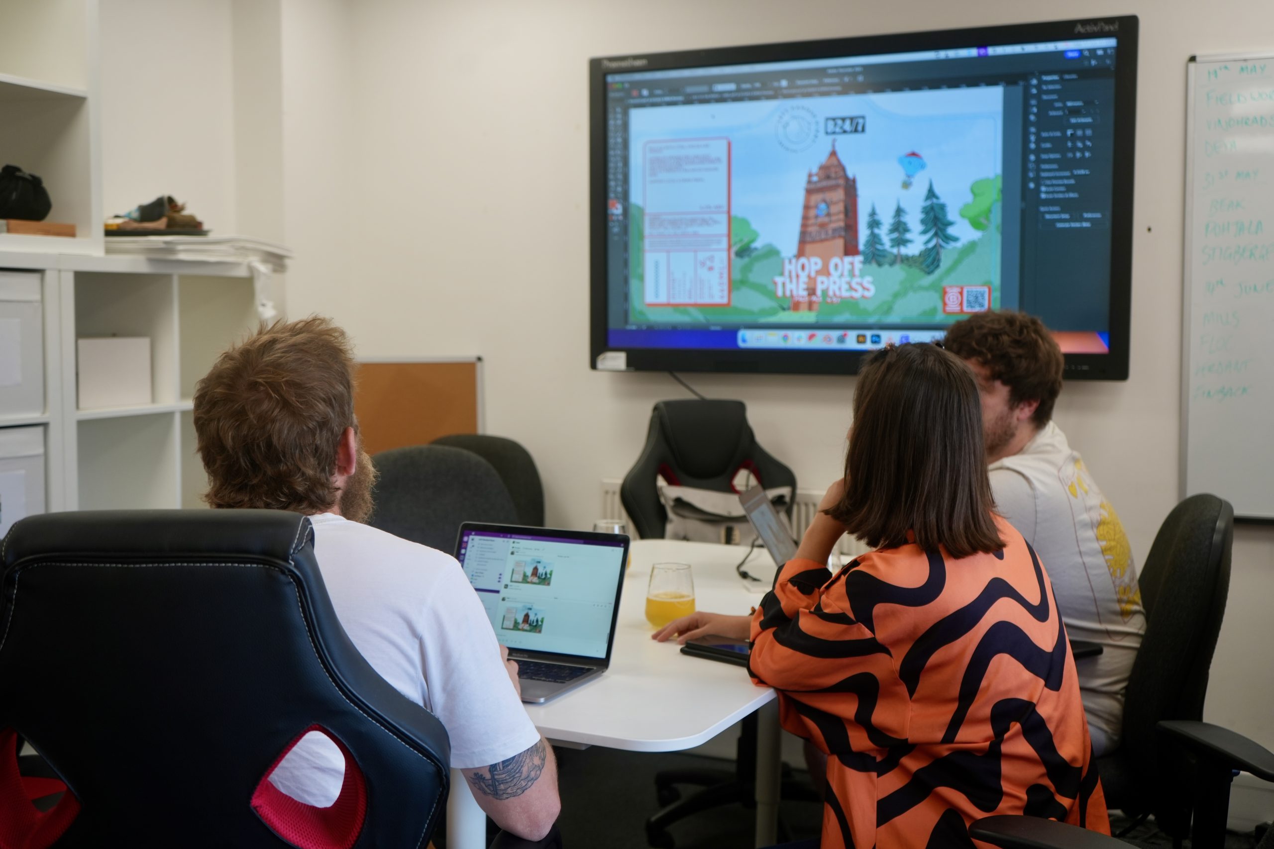 The Left Handed Giant team and Leonor from Bristol24/7 working on the branding for Hop off the Press special beer