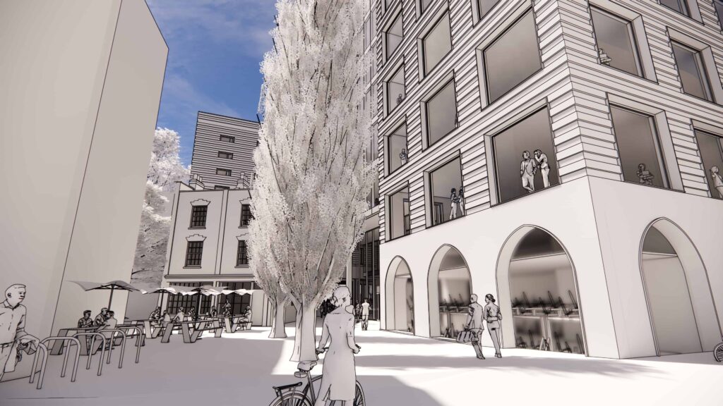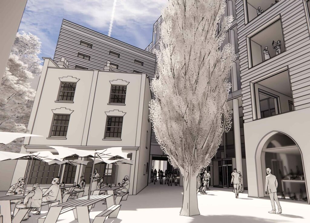 Developers envisage “a large, attractive urban courtyard, with the Cornubia at its heart” – image: Boultbee Brooks