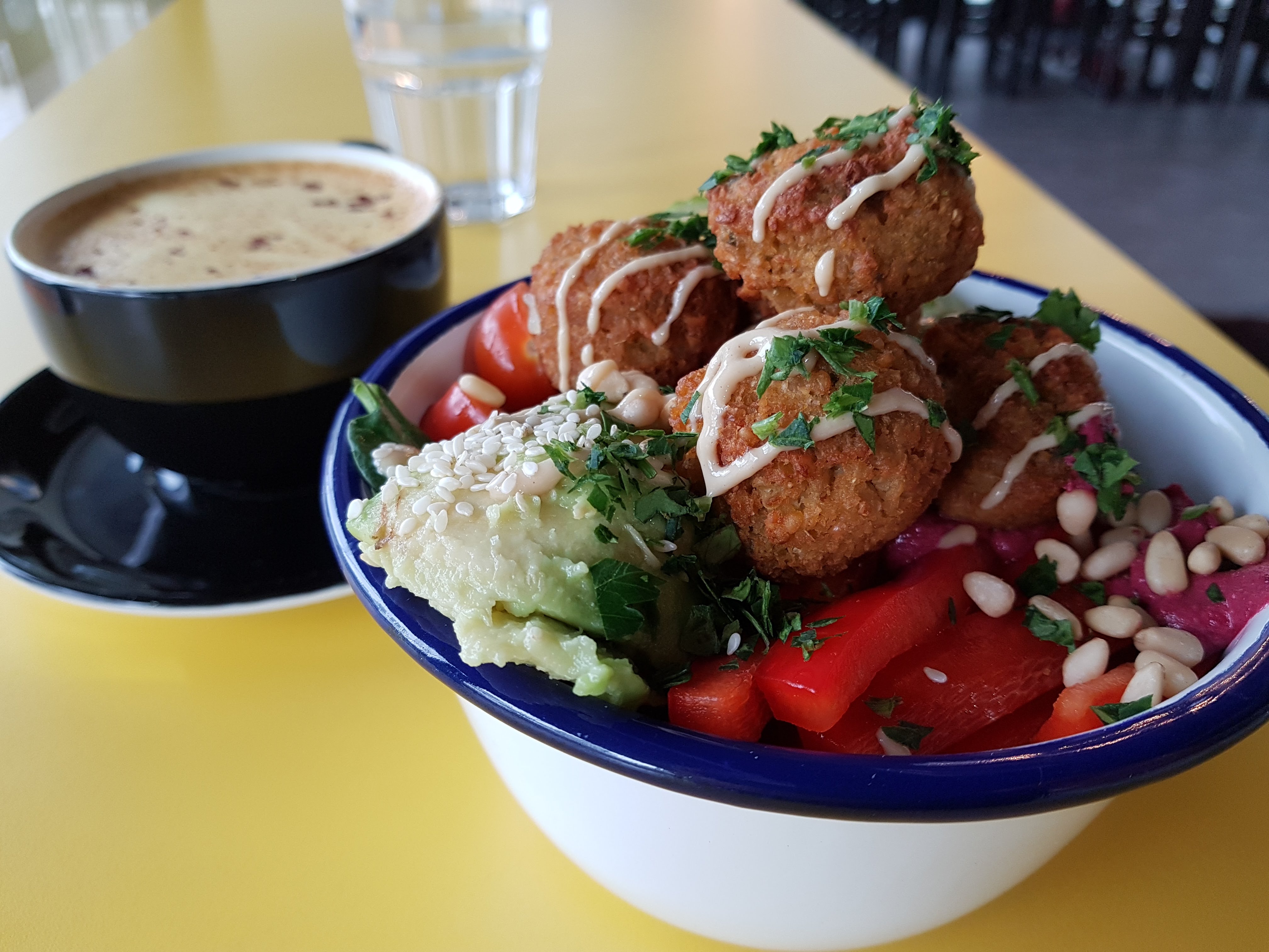 It’s not long before a bowl piled high with falafel goodness arrives – with a calorie count of 609, 67grams of carbs and a cost of £6. More importantly, it’s a visual delight, with the vibrant ingredients artfully arranged.