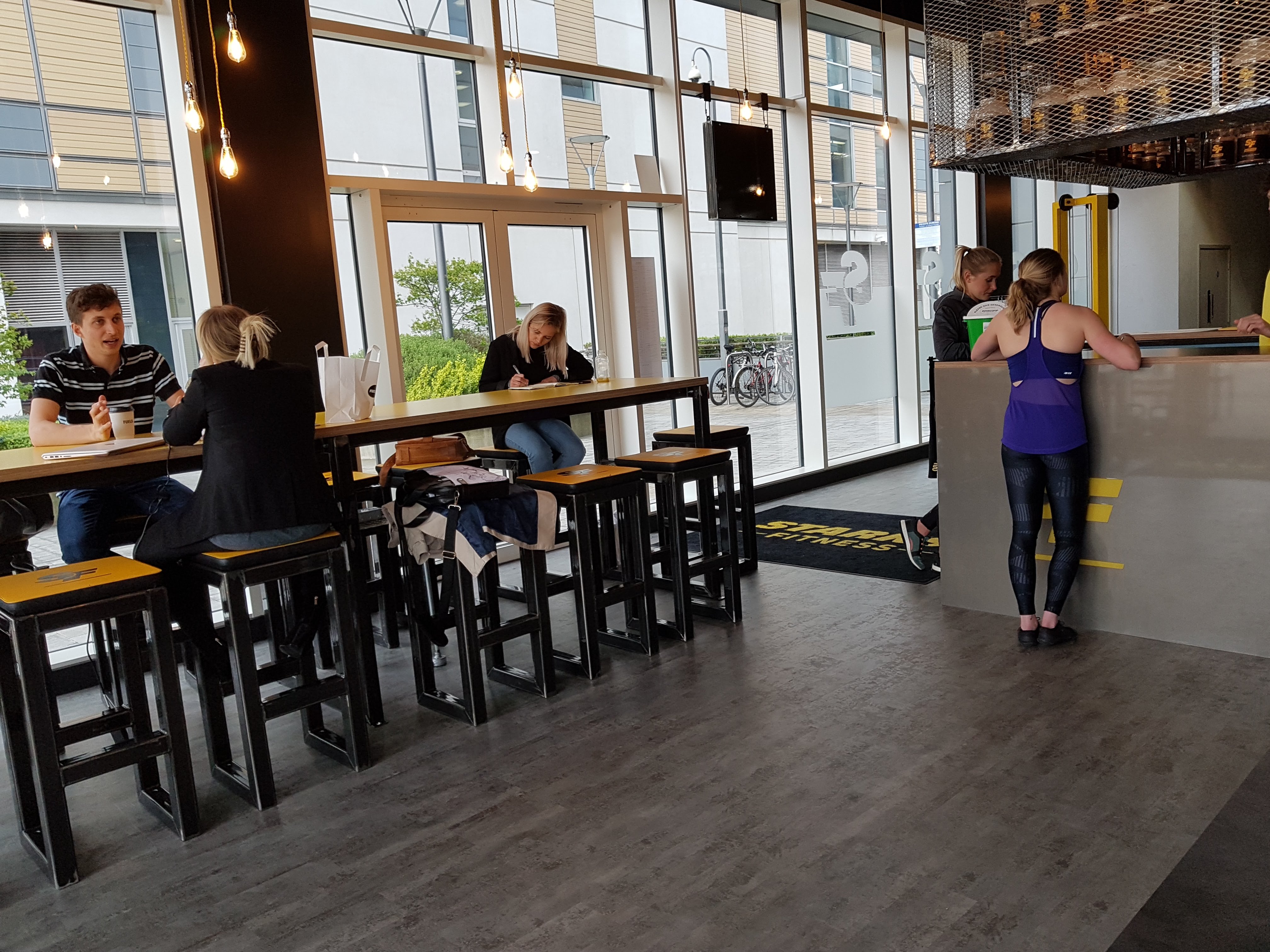 In a corner spot by the window, it is possible to take in the tranquil riverside views, as well as peek through a wire mesh into the gym area, where loud pop music is masking the sound of grunts and shouts as a group of people are put through their paces on the immaculate yellow and grey flooring.