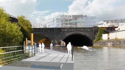A floating boardwalk could link Temple Quay to the future site of Bristol Arena. The proposed Harbour Walkway will provide a pontoon boardwalk from the ferry landing stage to ‘Arena Island’ wide enough to accommodate pedestrians and cyclists. The route will pass under the railway viaduct and continue to Totterdown Basin, along a corridor that is planned to be redeveloped with cafes, offices and flats built over the next decade.