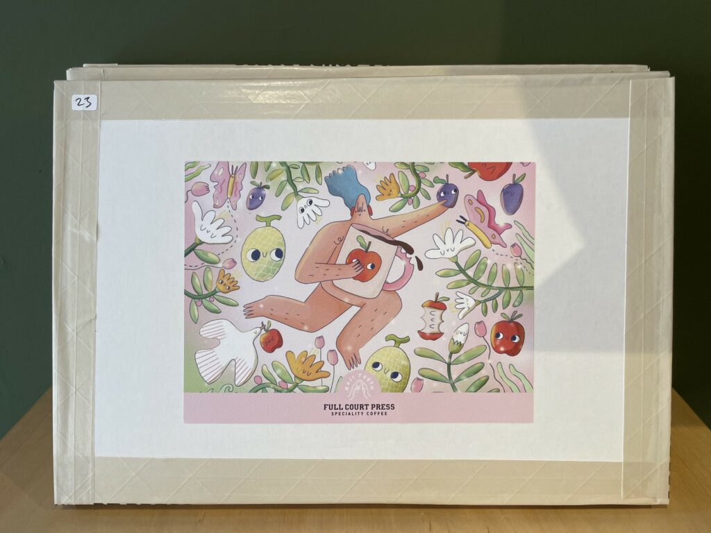 The artwork is based around how the Pink Bourbon coffee made her feel and is inspired by tasting notes including red apple, melon and florals.