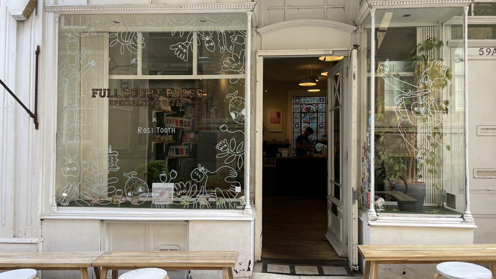 The windows of Full Court Press have been illustrated by an artist whose custom creations also feature on a very special bag of coffee.