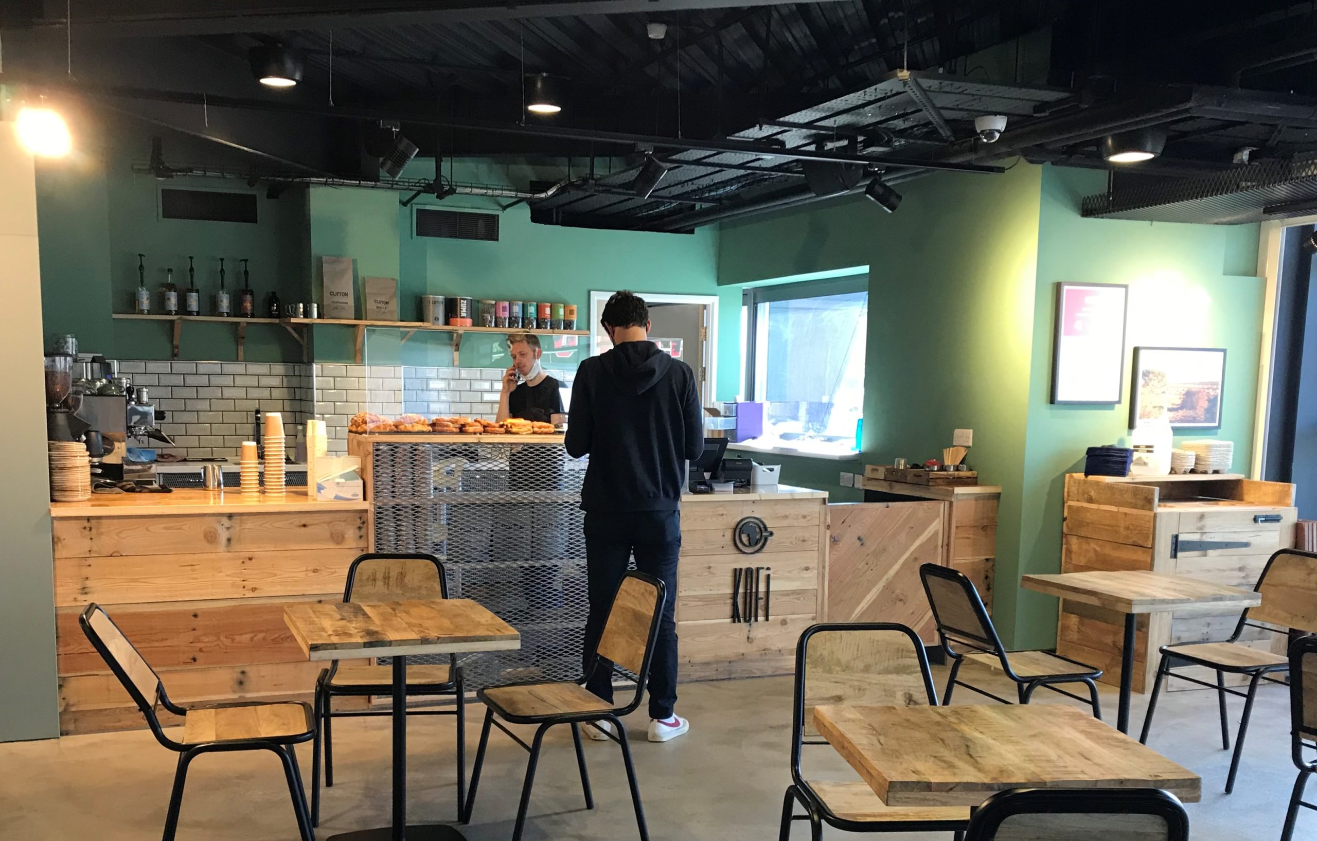 With reclaimed wood making up the tables, chairs, benches and bar, and piles of pastries on display on the counter, Kofi Lounge would not look out of place on North Street or Gloucester Road.
