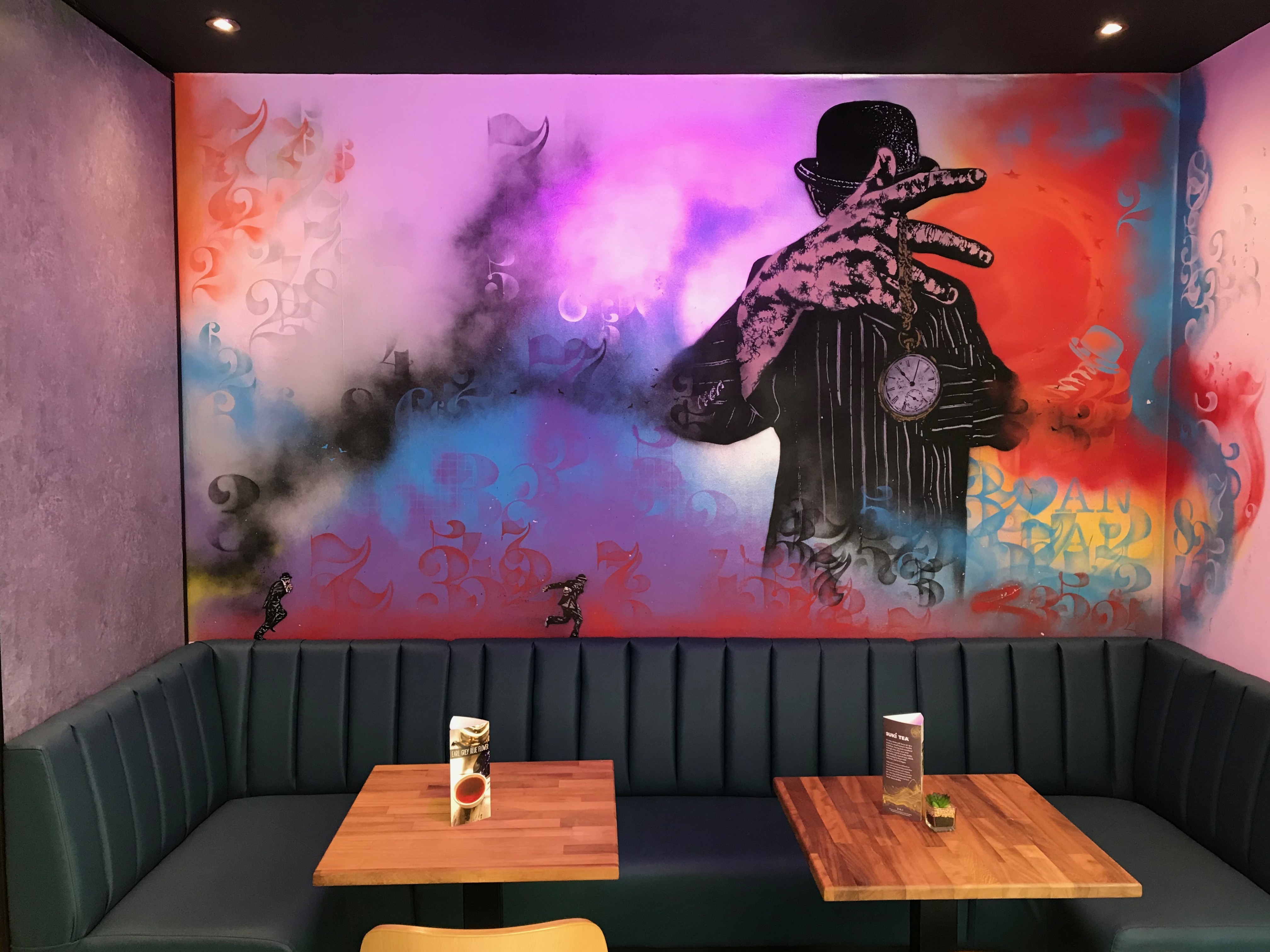 The hot coffees are served in branded Hatter House Cafe cups and saucers, whose teal colour matches the chairs and banquettes, above one of which in a corner is a mural by Bristol street artist Nick Walker.