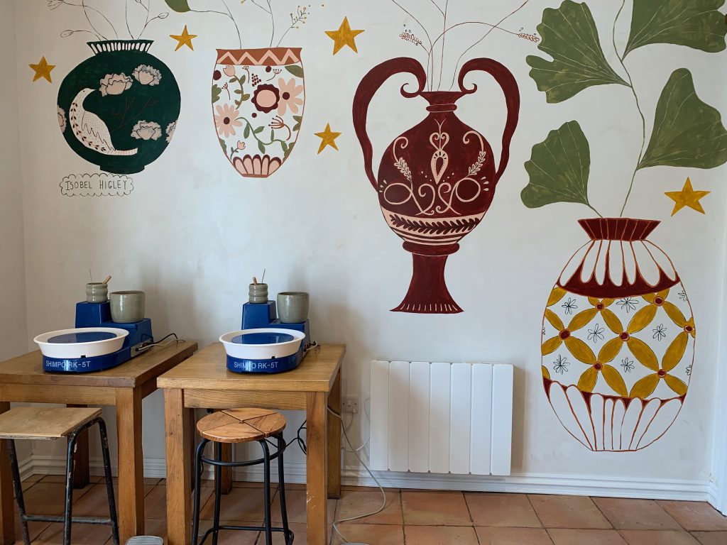 The pottery wheels sit at the back on the cafe, with a beautiful mural in the background