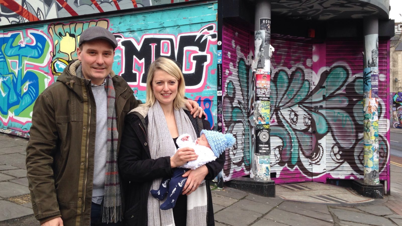 Imogen and Kieran Waite, and their three-week-old son Mostyn, stand on the corner of Stokes Croft and Thomas Street, outside a building that they got the keys to one day after the arrival of their second child Mostyn on Valentine’s Day.