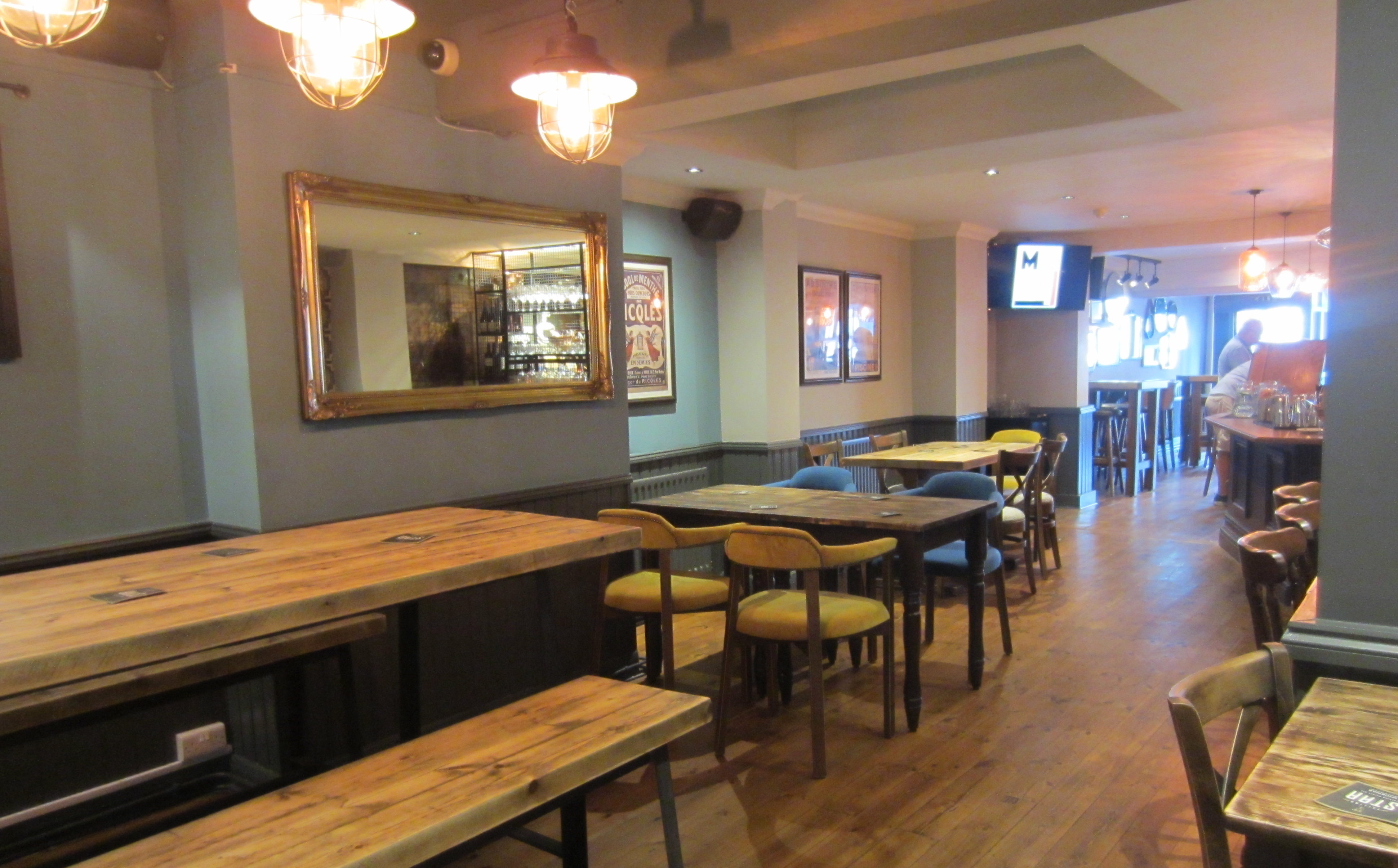 The formerly closed pub has recently reopened under new ownership and a faint waft of fresh paint is still detectable as the door opens to reveal a vast interior of rustic wooden tables and chairs atop polished wood floors. The walls are artfully adorned with a collection of mirrors and pictures.