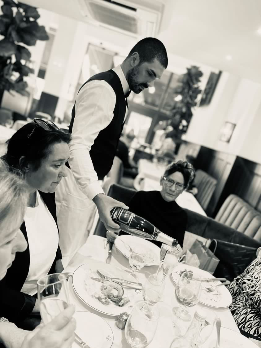 Staff wearing bow ties pouring Champagne underneath a crystal chandelier.