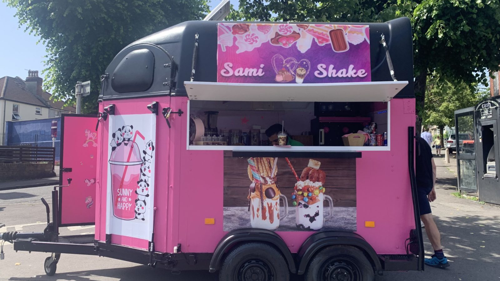 Ali has converted what used to be a horse box into his milkshake pop-up, giving the trailer a new lease of life through a lick of bright-pink paint and pink disco lights.