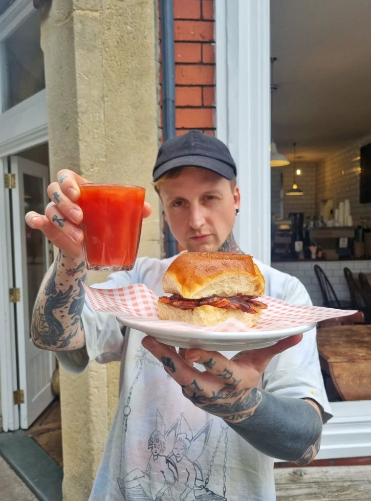 Ben Martin outside Wilson’s Bread Shop with their famous bacon roll and bloody Mary – photo: Wilson’s
