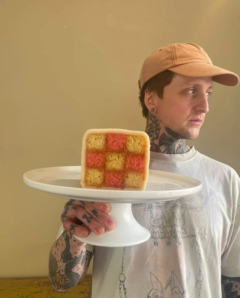 Ben and a Battenberg he made with almond sponge, rose sponge, apricot jam and marzipan – photo: Wilson’s