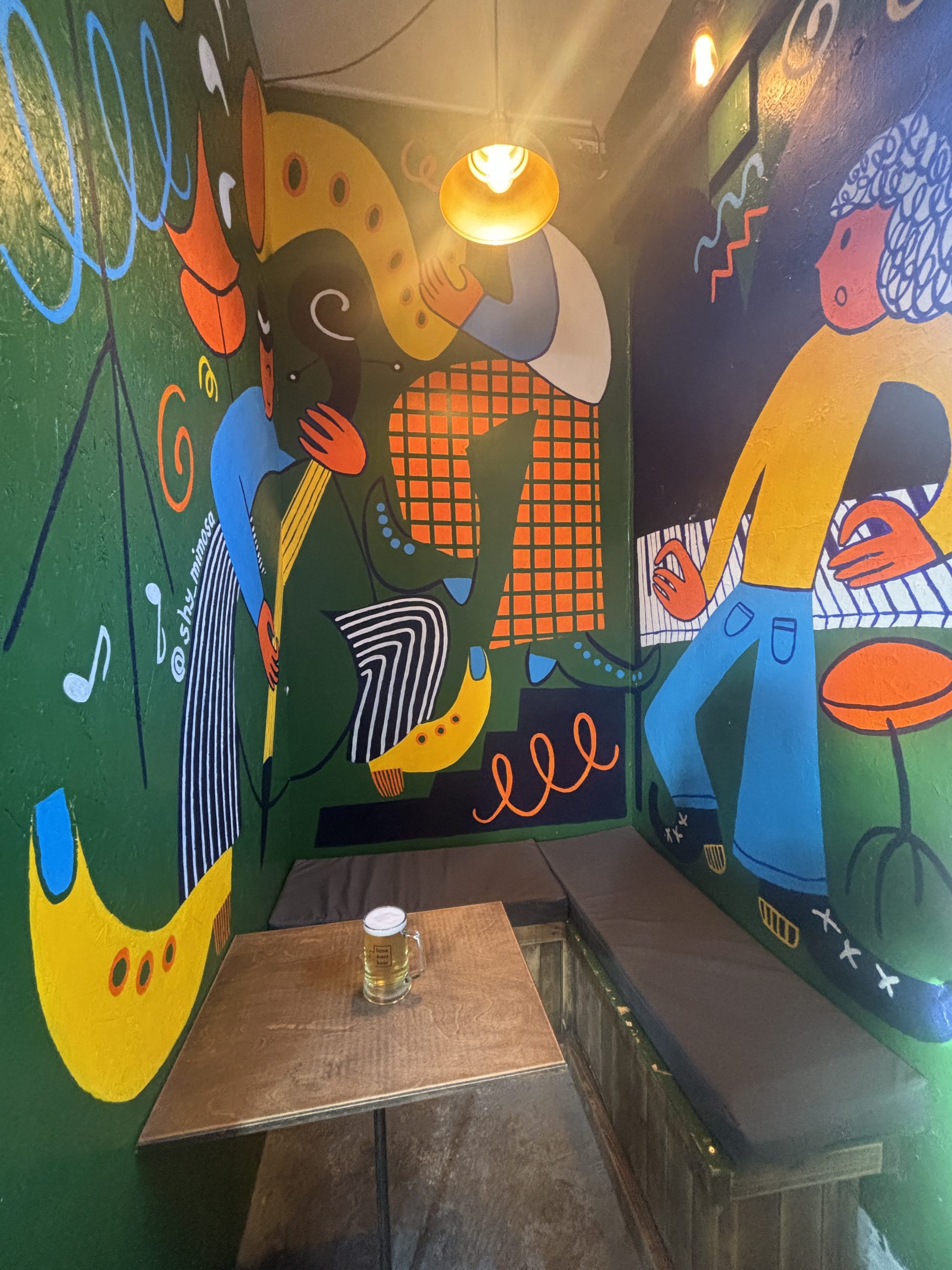 Deciding on a Lime Radler, one punter sits in a closed off corner decorated with a jazz-inspired mural by Martyna Grądziel.