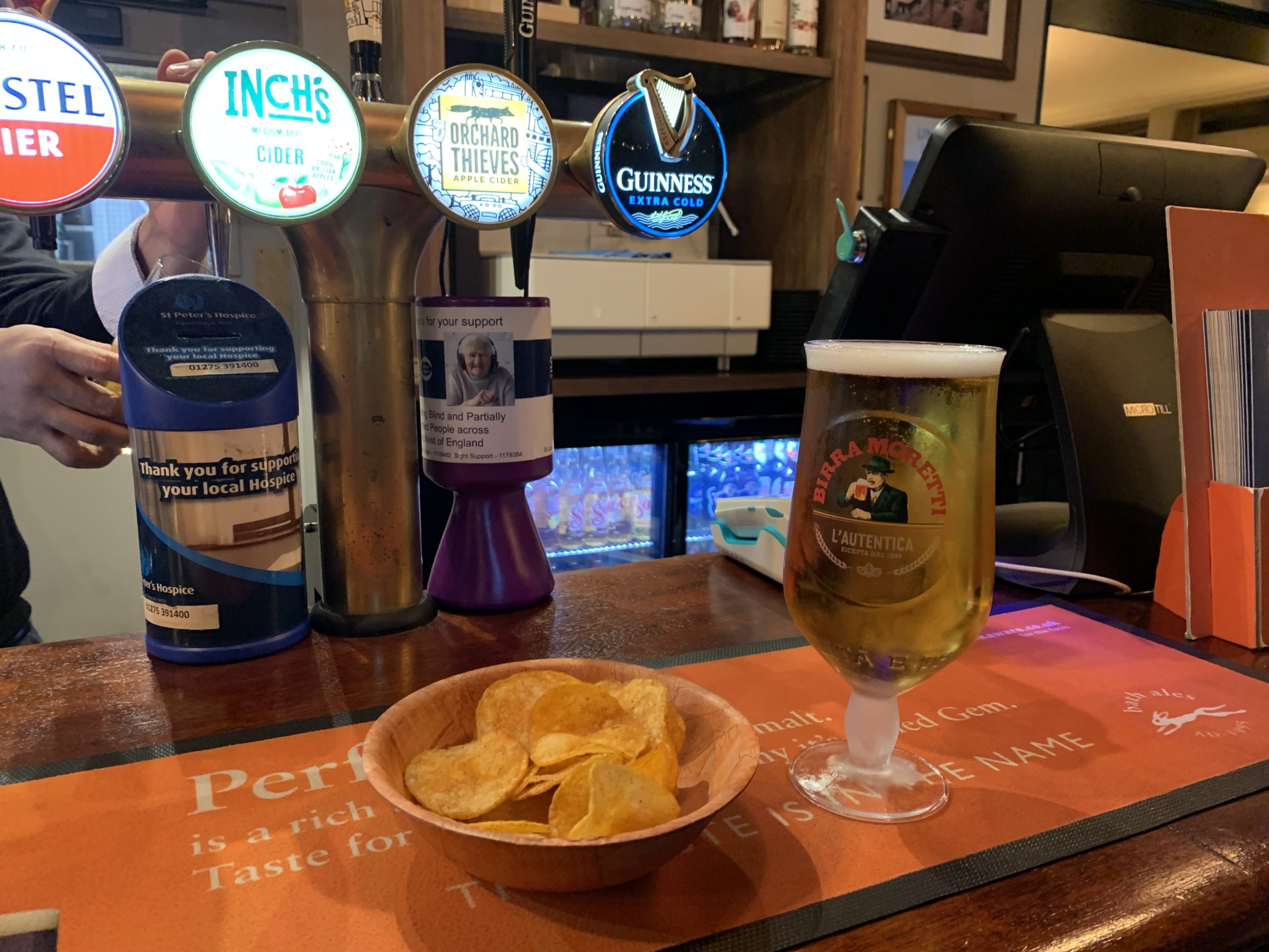 They settled on two Birra Morettis, a half pint of Orchard Thieves cider and a packet of salt and vinegar crisps served in a small wooden bowel.