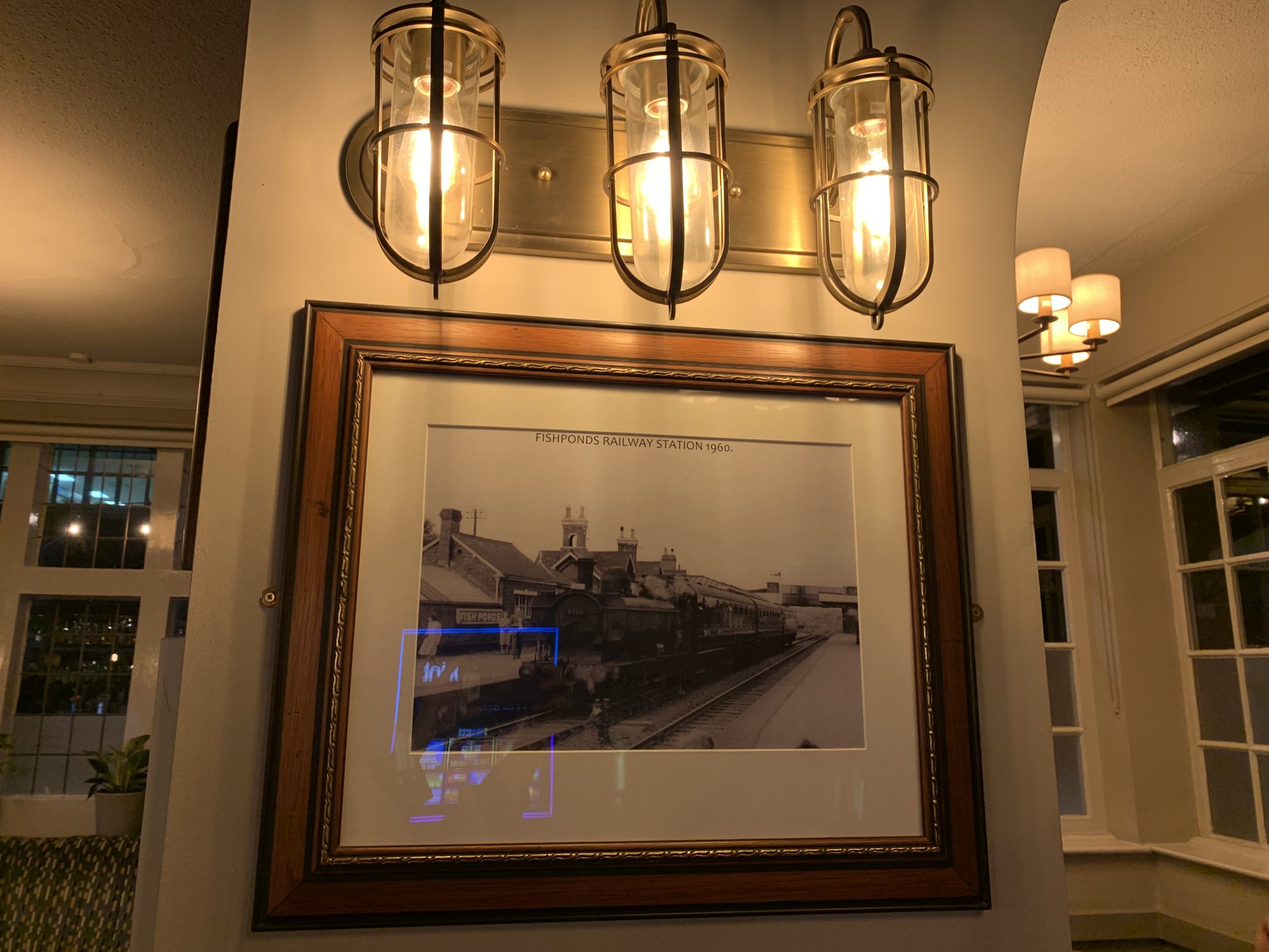 A black and white photo of Fishponds railway station on the wall of the Fishponds Tap