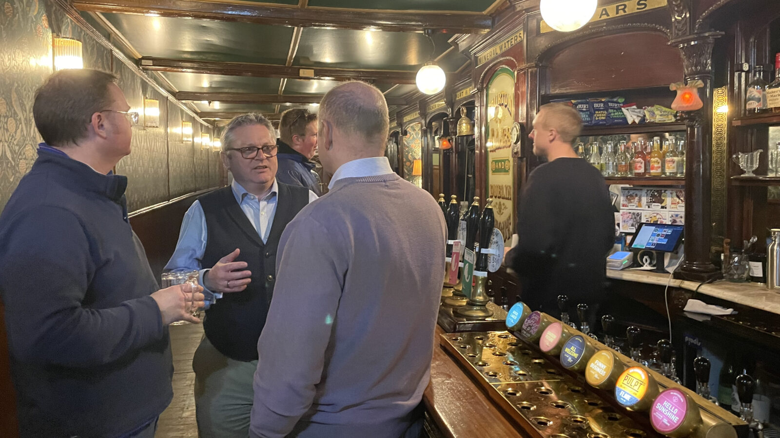 “I’ll have a pint of Good Lager, please,” says a well-speaking punter wearing a blue shirt and grey waistcoat.