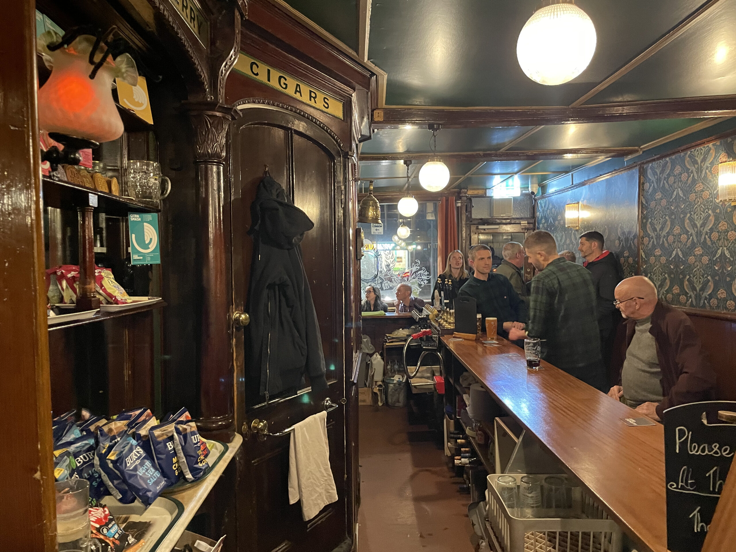 Drinkers sit in pairs or trios next along the bar, huddling together every now and again to let passersby make their way from the front entrance to a tram-shaped snug bar at the back or one of the pair of tiny WCs formed by part-glazed partitions.